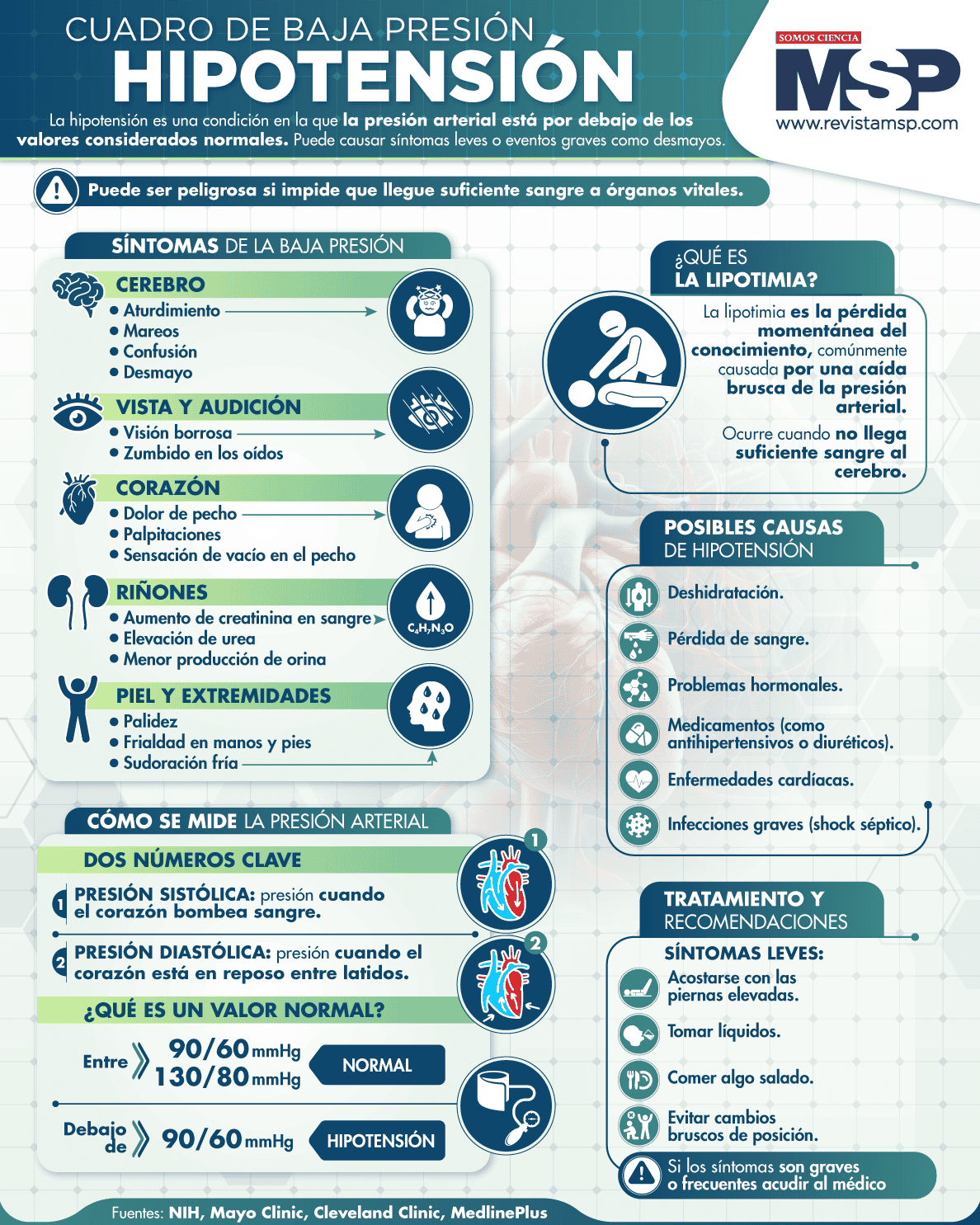 Con esta infografía aprende a identificar los síntomas, causas comunes y cómo actuar ante un episodio de presión baja.