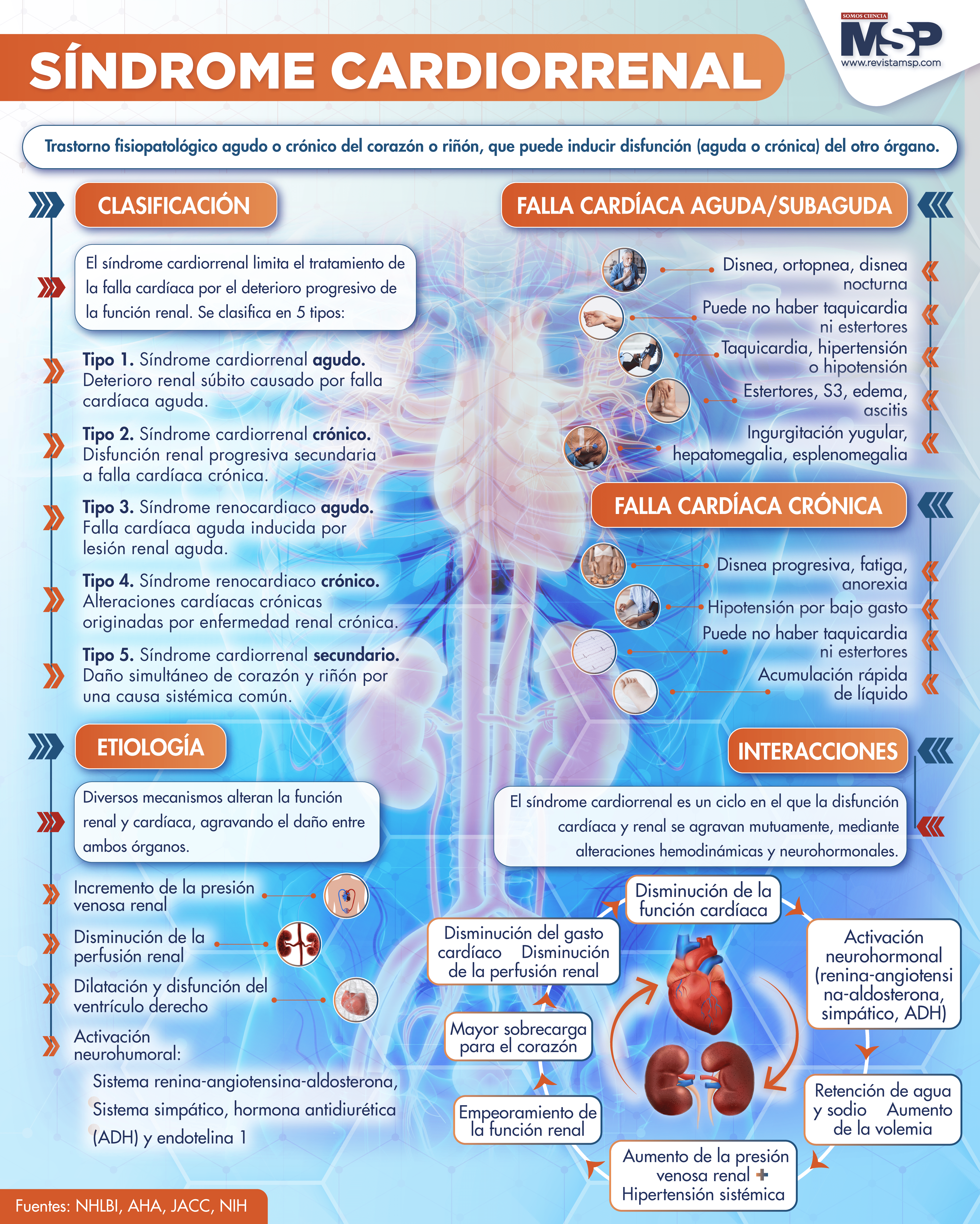 #InfografíaMSP ?? El corazón y los riñones están más conectados de lo que parece. Cuando uno falla, puede desencadenar un deterioro en el otro, dando lugar al síndrome cardiorrenal. Esta interacción puede presentarse de forma aguda o crónica.