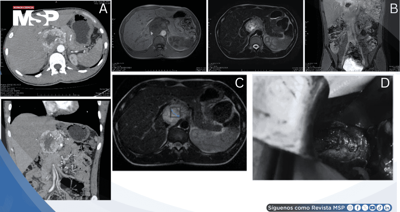 La tomografía computarizada contrastada demostró una masa bien definida de 7.2 × 6.5 × 5.4 cm, irregularmente esférica y heterogénea, con intenso realce arterial. Las imágenes axiales y coronales en fase arterial evidenciaron claramente su localización entre la vena porta y la vena cava inferior. Significativamente, no se observaron signos de invasión al lóbulo caudado hepático, páncreas, vena porta, vena cava inferior ni glándulas suprarrenales, hallazgos posteriormente confirmados quirúrgicamente.