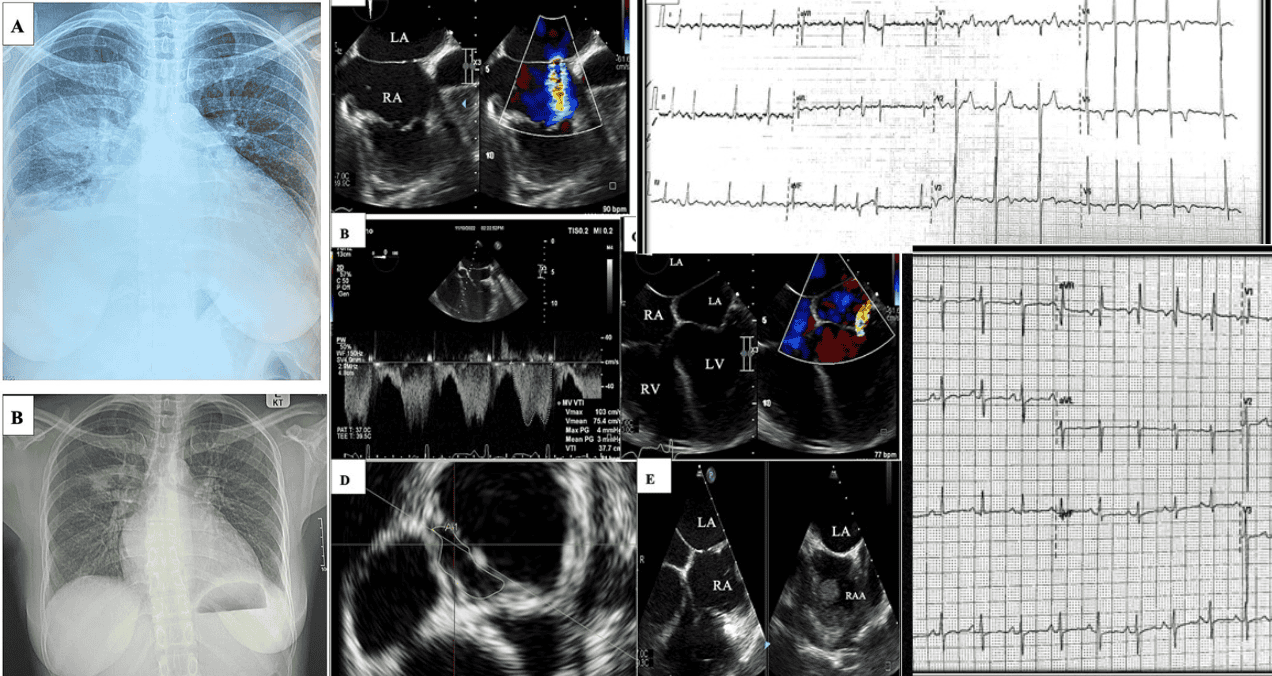 La fracción de eyección del ventrículo izquierdo estaba gravemente reducida al 20%. Una ecocardiografía transesofágica (ETE) más detallada reveló hallazgos críticos: una pequeña comunicación interauricular (CIA) con un área 3D de 0,42 cm² que provocaba un cortocircuito de izquierda a derecha, y una membrana en la aurícula izquierda, por encima de la válvula mitral, consistente con un cor triatriatum.