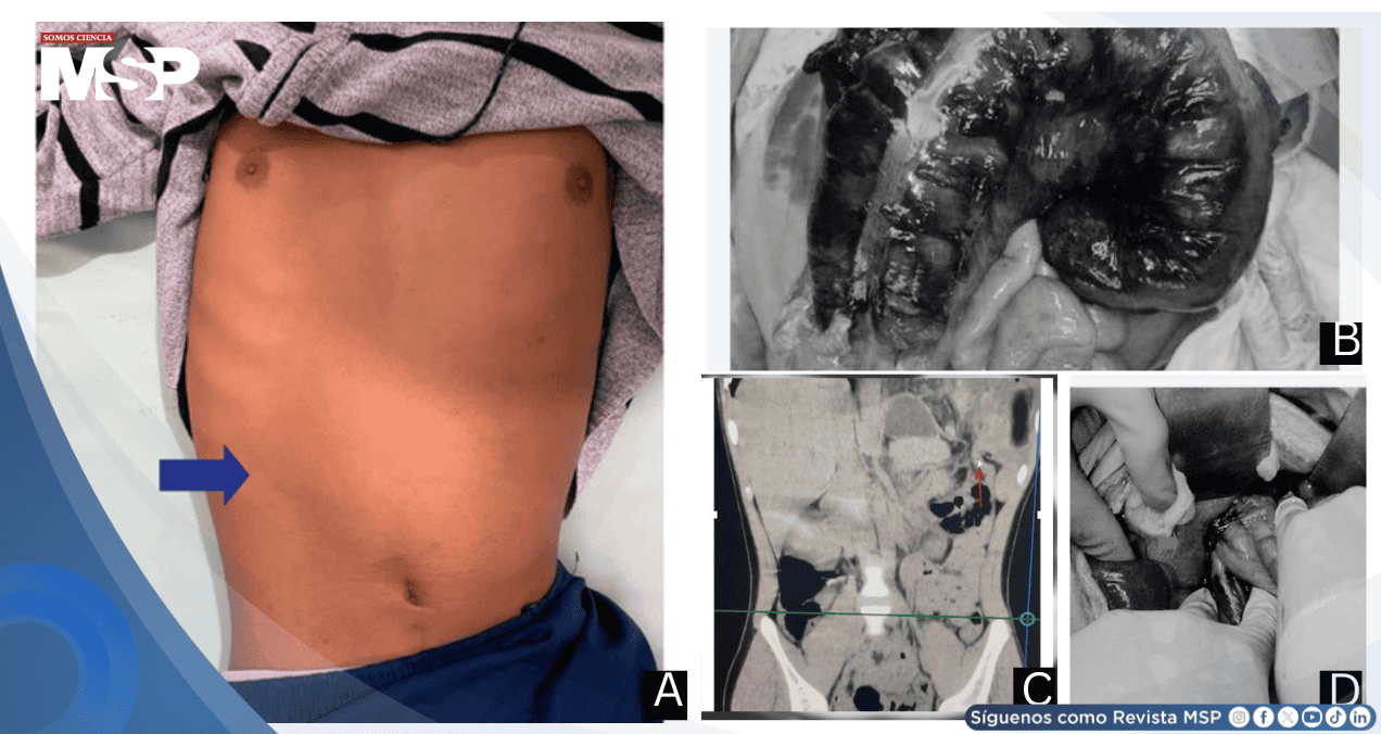 El paciente negaba cirugías o traumatismos previos, consumo de alcohol, aunque refería tabaquismo de un paquete diario. Adicionalmente, reportaba incapacidad para evacuar gases y heces durante los dos días previos a la consulta.
