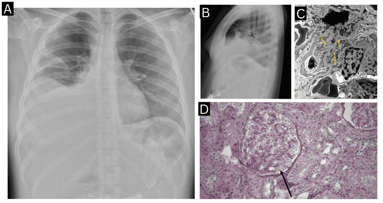 Ante estos hallazgos, se realizó biopsia renal que demostró nefritis lúpica proliferativa mesangial clase II, con microscopía electrónica mostrando depósitos mesangiales y eliminación difusa de podocitos.