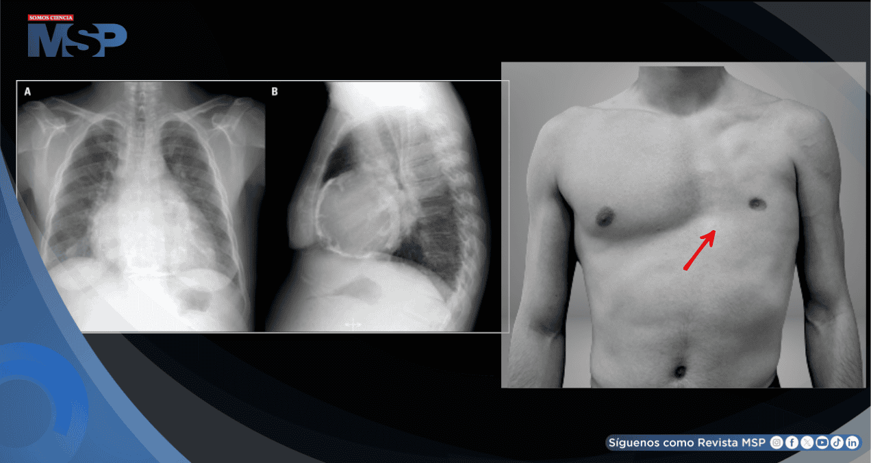 El paciente era independiente para sus actividades diarias y trabajaba en el sector de la construcción. No fumaba, no consumía alcohol ni otras sustancias, y no conocía antecedentes familiares de anomalías similares en el tórax o las extremidades.