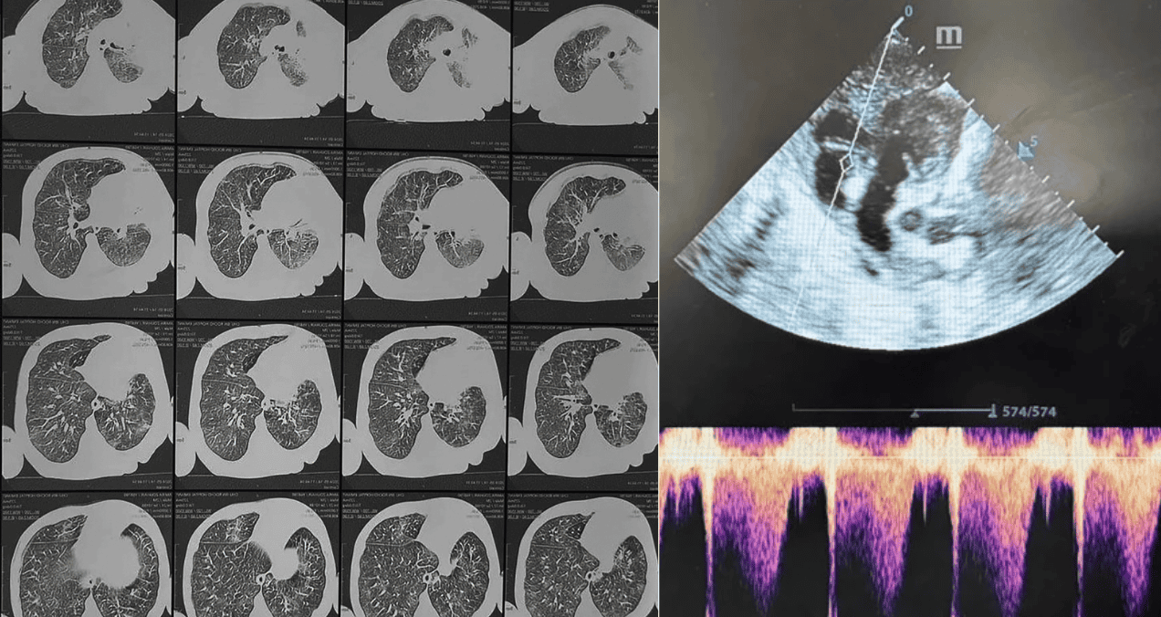La PCR, paradójicamente normal (0.6 mg/L), no restó gravedad al cuadro. La RT-PCR confirmó la presencia de la bacteria Bordetella pertussis, y la tomografía torácica evidenció neumonía alveolointersticial con atelectasia del lóbulo medio. El hallazgo crucial llegó con la ecocardiografía: hipertensión pulmonar (PAPs 46 mmHg) sin cardiopatía estructural, secundaria a la infección.