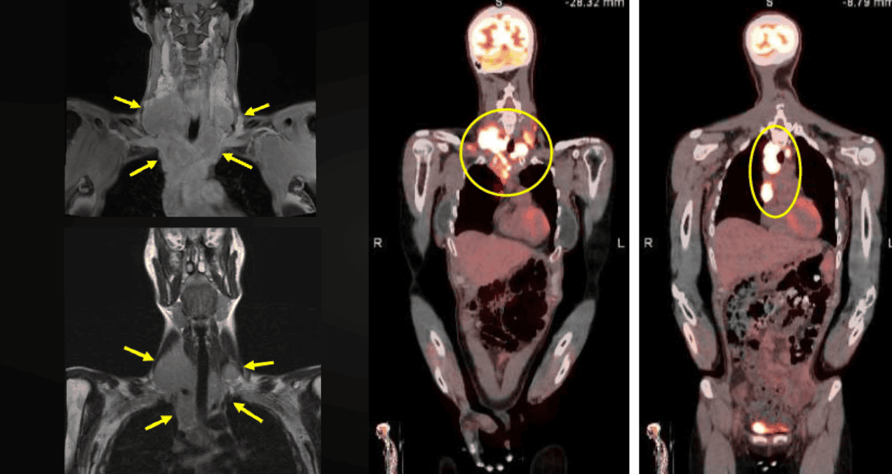 La tomografía computarizada de cuello y tórax reveló adenopatías múltiples bilaterales en cadenas cervicales y mediastínicas. La resonancia magnética cervical mostró compromiso ganglionar supraclavicular y subcarinal bilateral.