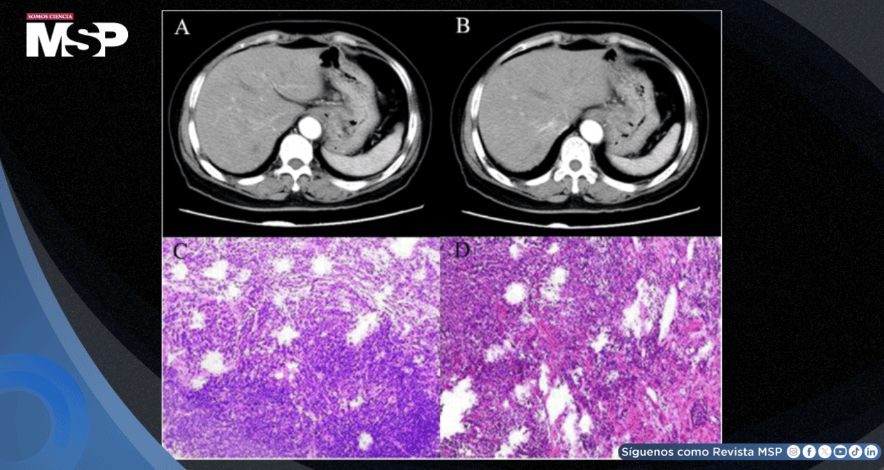 Además, se observaron múltiples metástasis en los ganglios linfáticos localizados entre el hígado y el estómago, así como en el espacio retroperitoneal. Estos hallazgos radiográficos fueron altamente sugestivos de una lesión maligna gástrica invasiva, con infiltración de la capa muscular profunda de la pared del estómago y la presencia de un trombo tumoral vascular.