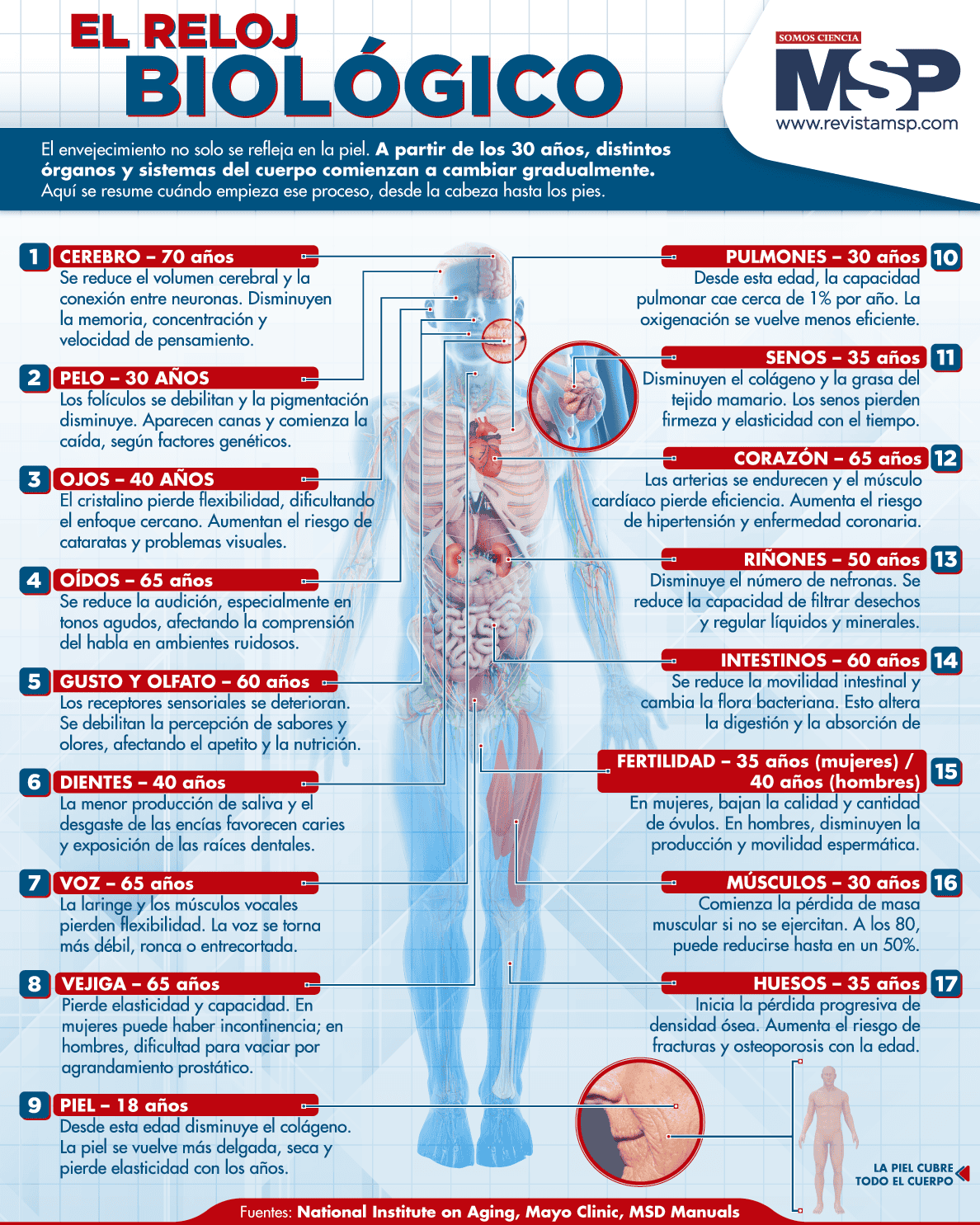 #InfografíaMSP ? Aunque solemos asociar el envejecimiento con la piel o el cabello, lo cierto es que muchos órganos empiezan a cambiar desde los 30 años. Estos procesos ocurren de forma gradual y silenciosa en todo el cuerpo.