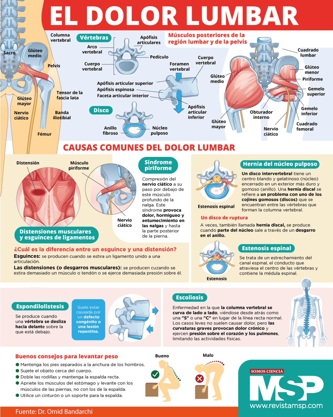 Conoce más sobre el dolor lumbar con esta infografía que hemos preparado para ti.