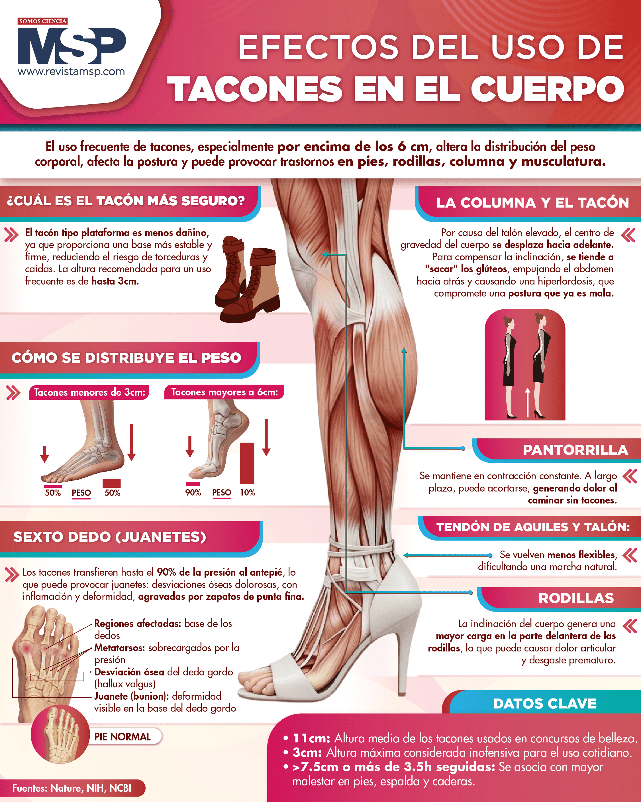 #InfografíaMSP El uso frecuente de tacones altos altera la postura, sobrecarga el antepié y afecta desde los pies hasta la columna vertebral, aumentando el riesgo de juanetes, dolor muscular y desgaste articular.
